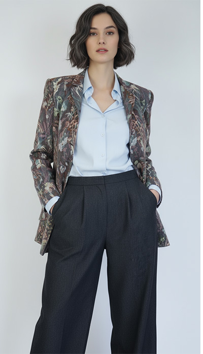 Try the Boxy Jacket in tweed check. A lovely interpretation of the 647 Boxy Jacket pattern. Shown here with the 931 Front Pleat Trousers