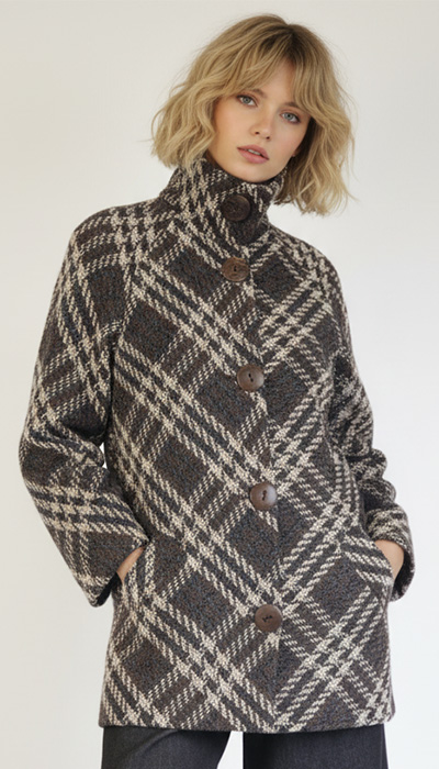 Four years ago I made plans to use up fabric I had stored away for far too long. What a wasted resource. I made the Frock Coat from the furnishing brocade. I made the Boxy Jacket from my scant 1 metre of Harris Tweed. But I never got around to this lovely loose weave bold check. I was thinking at the time of a big coat or jacket with a generous shawl collar but after looking at this fabric again, I decided it would be too overwhelming. So to bring you up to date, I developed this Raglan Sleeve Jacket. It has a Storm Collar which buttons up high to keep you cosy.